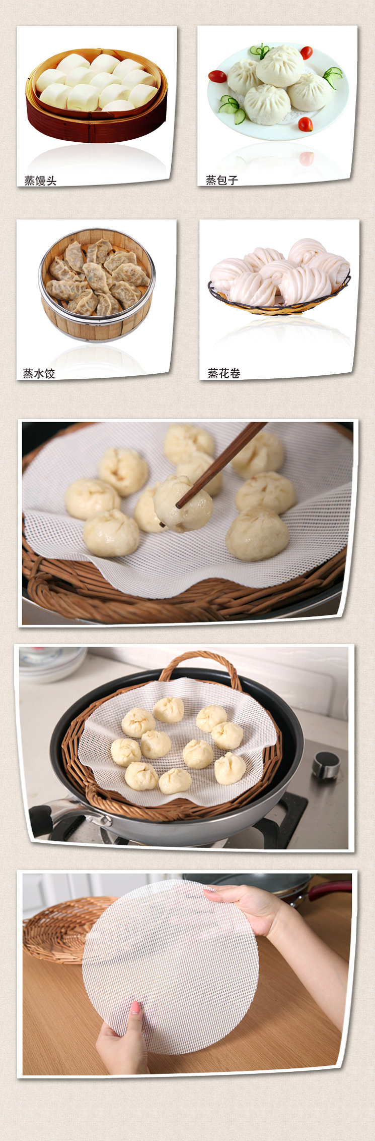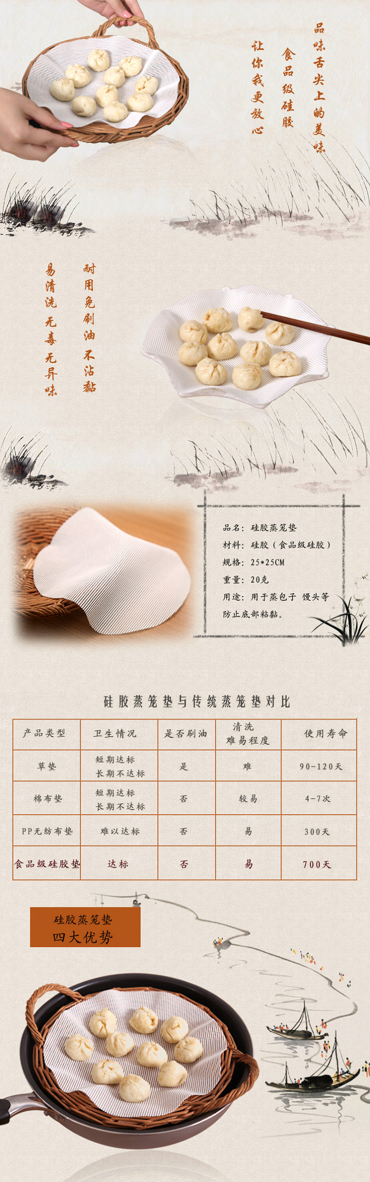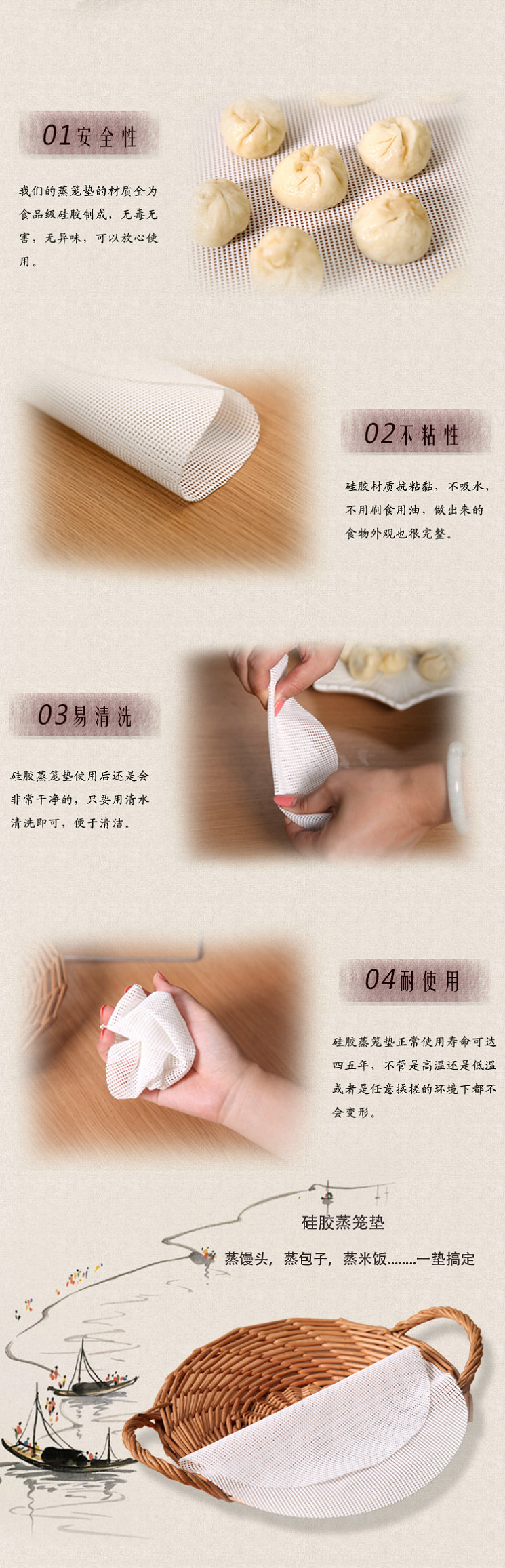 解決了包子鋪粘包子的煩惱,高溫硅膠蒸籠墊原料采用食品級(jí)的硅膠內(nèi)有高強(qiáng)度耐高溫纖維而成,具有不粘油污、易清潔、強(qiáng)度高、耐摩擦、可反復(fù)使用等優(yōu)異性能,生產(chǎn)效率高,廣泛用于速凍食品、食品蒸煮等加工行業(yè);24小時(shí)連續(xù)使用壽命可超過5年